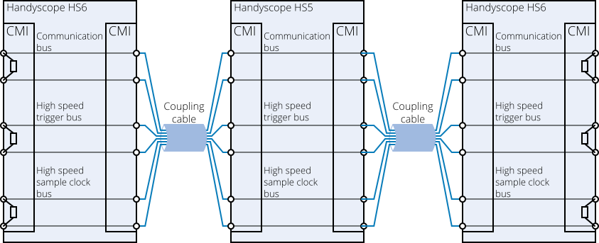 CMI 接口包含高速取樣時鐘匯流排,可確保每臺 WiFiScope 及/或 Handyscope 完全同步運作,即使在最高取樣率下,所有儀器仍能保持完全相同取樣時鐘(時鐘誤差 0 ppm!)。高速取樣時鐘匯流排會自動配置,並在匯流排起始與末端自動完成終端處理。